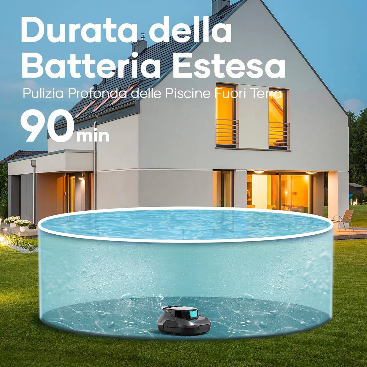 Pulizia efficiente e senza sforzo per piscine fuori terra fino a 80 m², con attivazione one-click, design idrodinamico e sistema di auto-parcheggio intelligente.