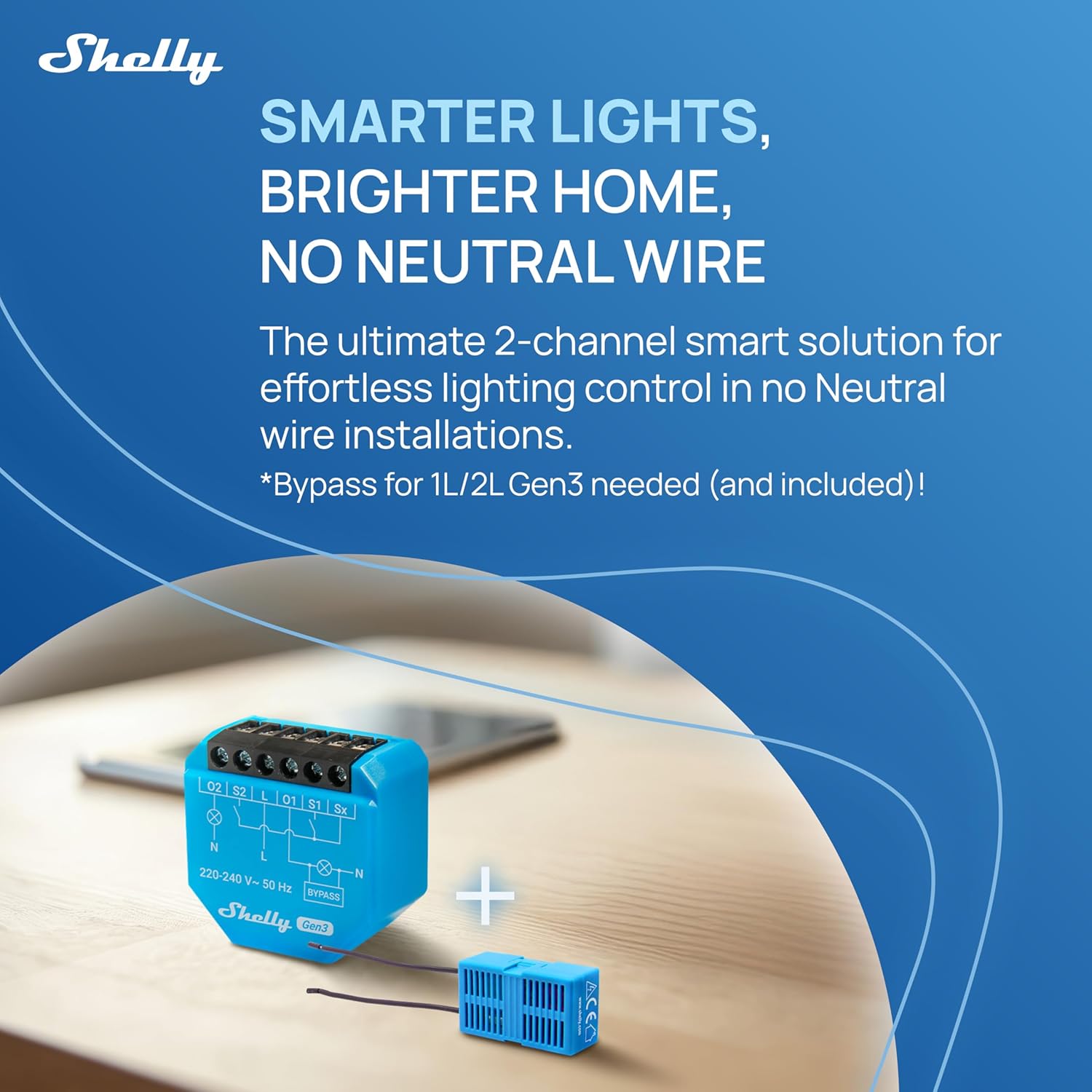 Shelly 2L Gen3 (il Dispositivo) è un interruttore intelligente compatto a due canali, progettato per un controllo preciso dell'illuminazione. Una caratteristica distintiva di questo dispositivo è che non richiede un filo neutro per funzionare. Tuttavia, necessita di uno Shelly Bypass 1L/2L Gen3 (incluso nella confezione) collegato in parallelo al carico sul primo canale. Shelly 2L Gen3 consente agli utenti di controllare facilmente le proprie configurazioni di illuminazione tramite smartphone, tablet, PC o sistema domotico integrato.