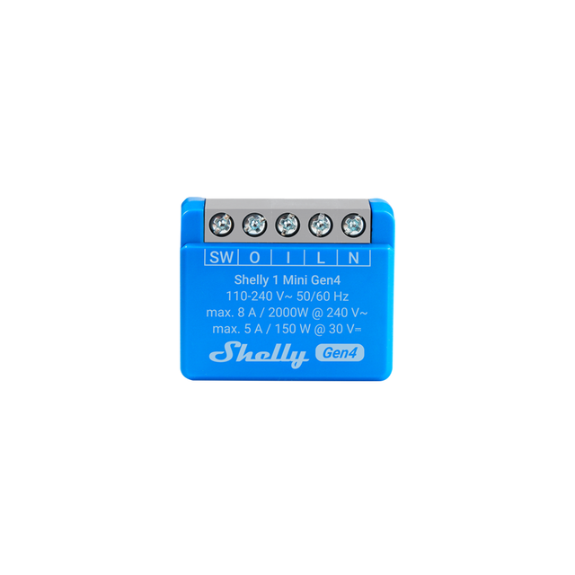 Shelly 1 Mini Gen4 è un interruttore intelligente compatto con contatti a potenziale zero, che consente il controllo remoto degli elettrodomestici tramite telefono cellulare, tablet, PC o sistema di domotica. Può funzionare in modalità standalone su una rete Wi-Fi locale o tramite servizi di domotica cloud. Il dispositivo è una versione migliorata di Shelly 1 Mini Gen3, con un processore più avanzato e connettività Zigbee.