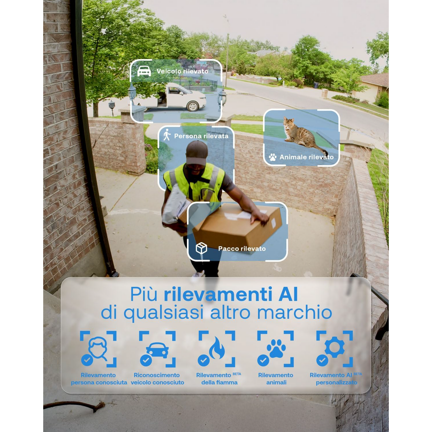 Grazie all’intelligenza artificiale Arlo, il sistema identifica persone, animali e veicoli, inviando notifiche mirate e riducendo i falsi allarmi.